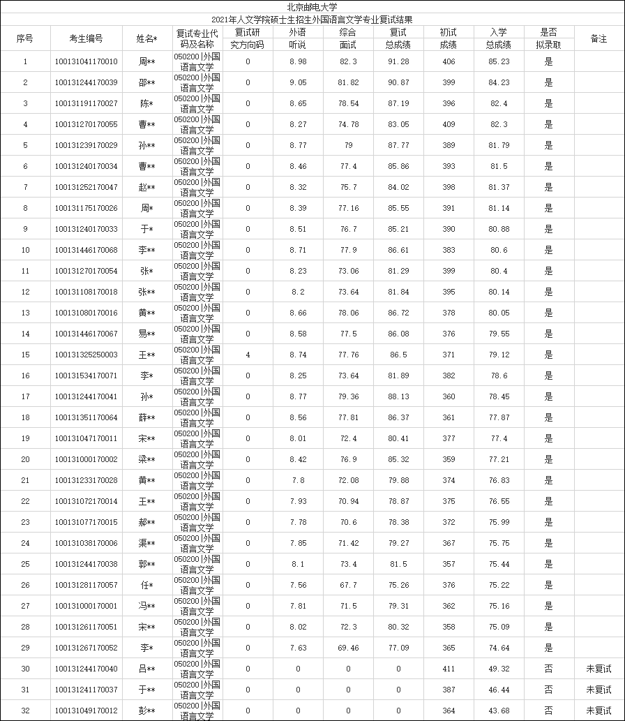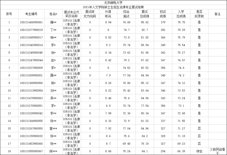 以上就是小编整理的“2021考研录取名单:北京邮电大学人文学院2021年外国语言文学专业与法律专业复试结果(第一批)”的全部内容,更多关于2021考研拟录取名单,北京邮电大学拟录取名单,考研拟录取名单的信息,尽在“考研拟录取名单”栏目,希望对广大学子有所帮助!