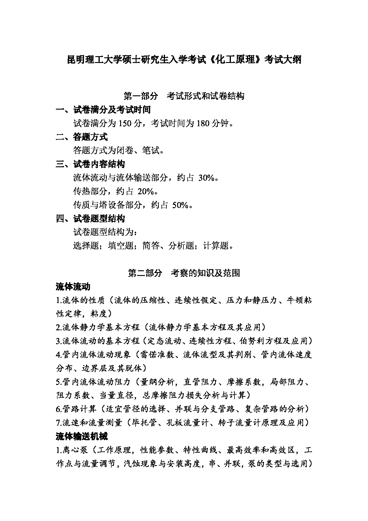 昆明理工大学硕士研究生入学考试《 化工原理 》考试大纲
