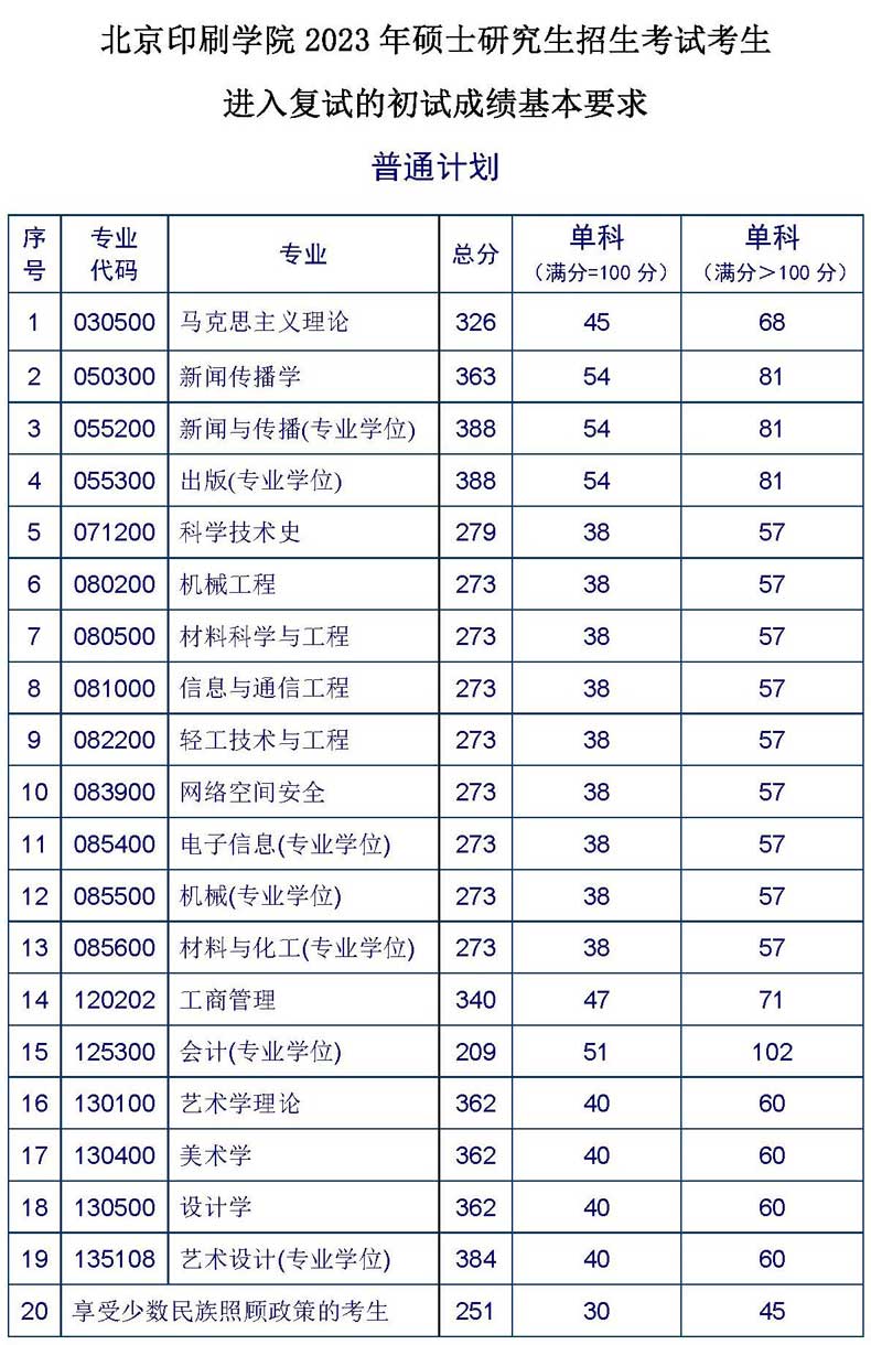 北京印刷学院2023年硕士研究生招生考试考生进入复试的初试成绩基本要求