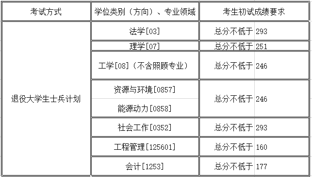 我校退役大学生计划复试分数线为初试总分达到考生报考专业所属学科门类的国家一区分数线的90%(四舍五入取整数)。具体分数线如下: