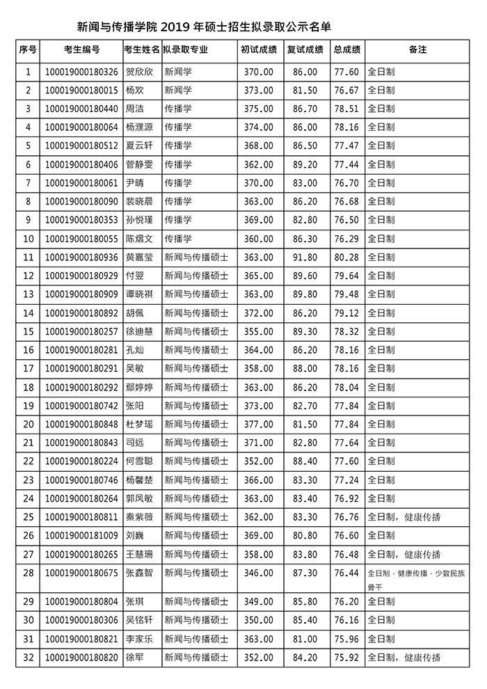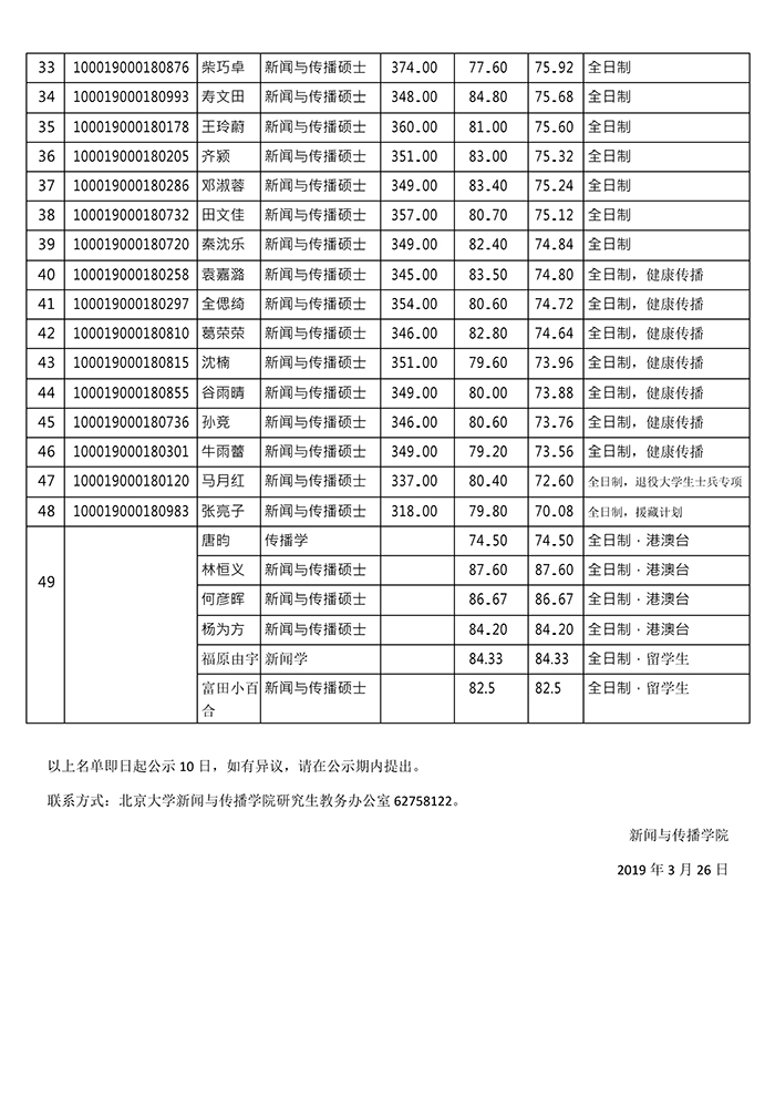 以上就是小编整理的“北京大学新闻与传播学院2019年硕士研究生拟录取名单”的全部内容,更多关于2019考研录取的信息,尽在“考研拟录取名单”栏目,定会对大家有所帮助!