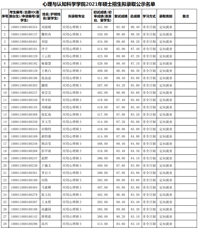 以上就是小编整理的“2021研究生拟录取名单:北京大学心理与认知科学学院2021年硕士考研招生拟录取名单”的全部内容,更多关于2021考研拟录取名单,北京大学拟录取名单,考研拟录取名单的信息,尽在“考研拟录取名单”栏目,下面我们一起来看看吧!