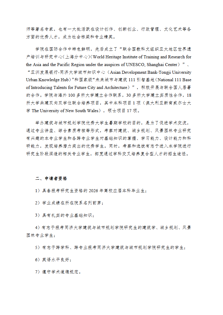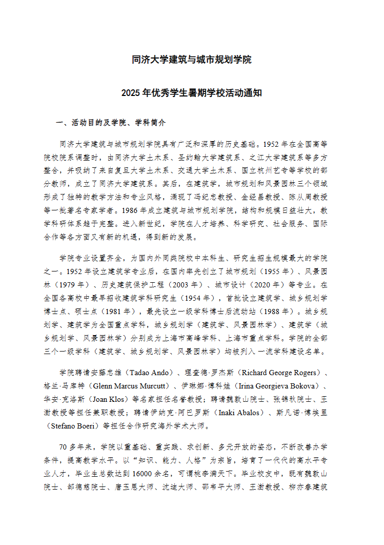 同济大学建筑与城市规划学院2025年优秀学生暑期学校活动通知发布时间:2025-05-22