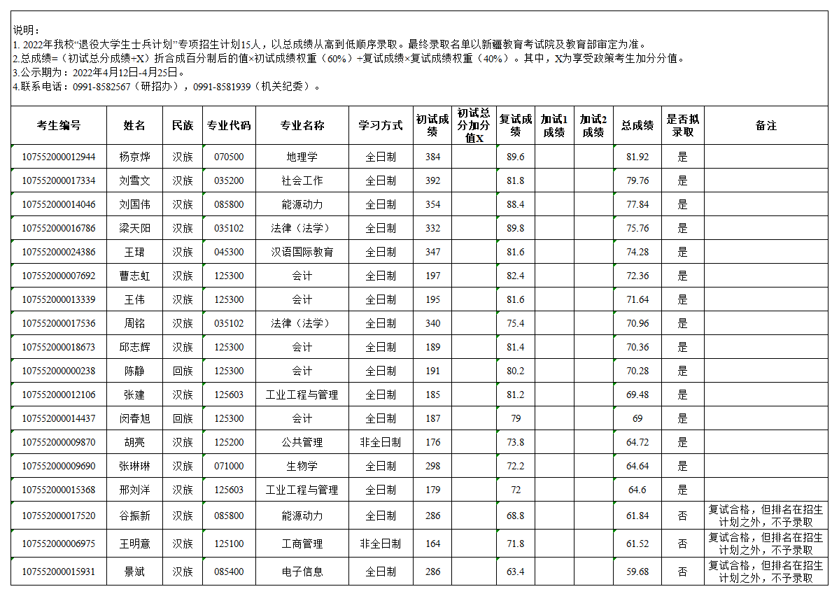 以上就是小编整理的“2022考研拟录取名单:新疆大学2022年硕士研究生招生考试“退役大学生士兵计划”考生复试成绩及拟录取名单”的全部内容,更多关于2022考研拟录取名单,新疆大学拟录取名单,考研拟录取名单的信息,尽在“考研拟录取名单”栏目,定会对大家有所帮助!